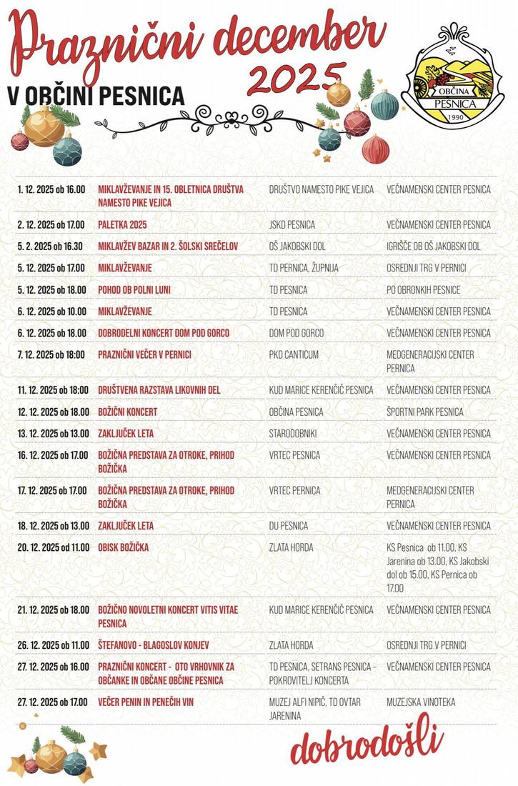 Drage občanke, občani in prijatelji naše občine, december v Pesnici bo tudi letos čaroben, srčen in poln druženja. Čaka nas niz prazničnih dogodkov za vse generacije – od Miklavževanja, koncertov, ustvarjalnih razstav, otroških predstav, pohodov, do tradicionalnih druženj ob koncu leta.