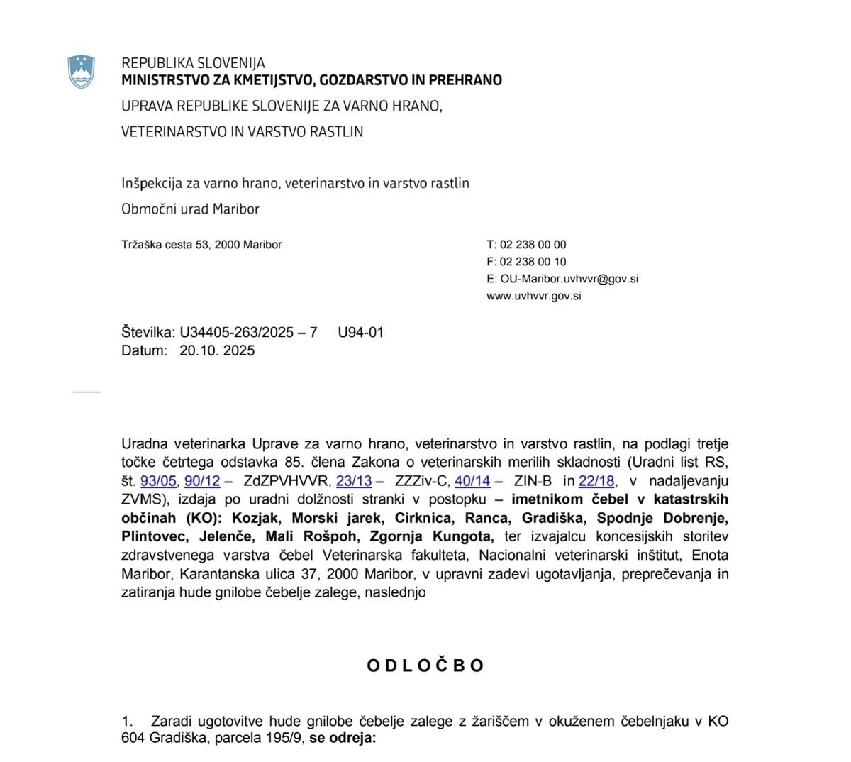 Uprava Republike Slovenije za varno hrano, veterinarstvo in varstvo rastlin je izdala odločbo zaradi ugotovitve hude gnilobe čebelje zalege z žariščem v okuženem čebelnjaku v KO 604 Gradiška, parcela 195/9.