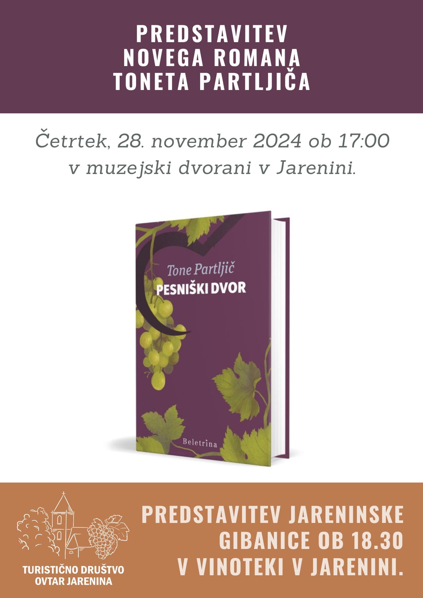 Ob 17. uri bo v muzejski dvorani predstavitev novega romana Toneta Partljiča Pesniški dvor. Z avtorjem se bo o romanu, ki se pridružuje njegovim številnim živahnim delom o Slovenskih goricah, pogovarjala Darka Tancer-Kajnih. Tokratna zgodba se odvije konec tridesetih let prejšnjega stoletja, v času vojne, taborišč in povojne stiske. V zaselku Pesniški Dvor ob reki Pesnici živi mogočna vinogradniška družina Gornik. Pisatelj pod drobnogled vzame njihovo usodo, vzpon in povojni propad. Zlasti ga zanima odnos med očetom Štefanom, slavnim pridelovalcem vina, in sinom Slavkom, ki ga ne »pokliče« zemlja, ampak pisanje. Tu so še jugoslovanski vojaki, ki gradijo severno Rupnikovo obrambno linijo, pa Nemci in nemškutarji, in tu so mladi, ki verujejo v utopične ideale boljševistične revolucije. Zdi se, da zgodovinski »vlak smrti« vsem prinese nekakšno streznitev. Zanosa polna, ljudsko obarvana in večkrat pretresljiva upodobitev kmeta in preprostega človeka.