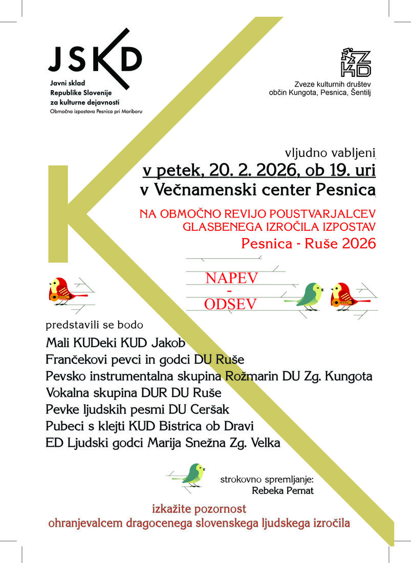 Območna revija poustvarjalcev glasbenega izročila NAPEV - ODSEV 2026 Območnih izpostav Pesnica pri Mariboru in Ruše
