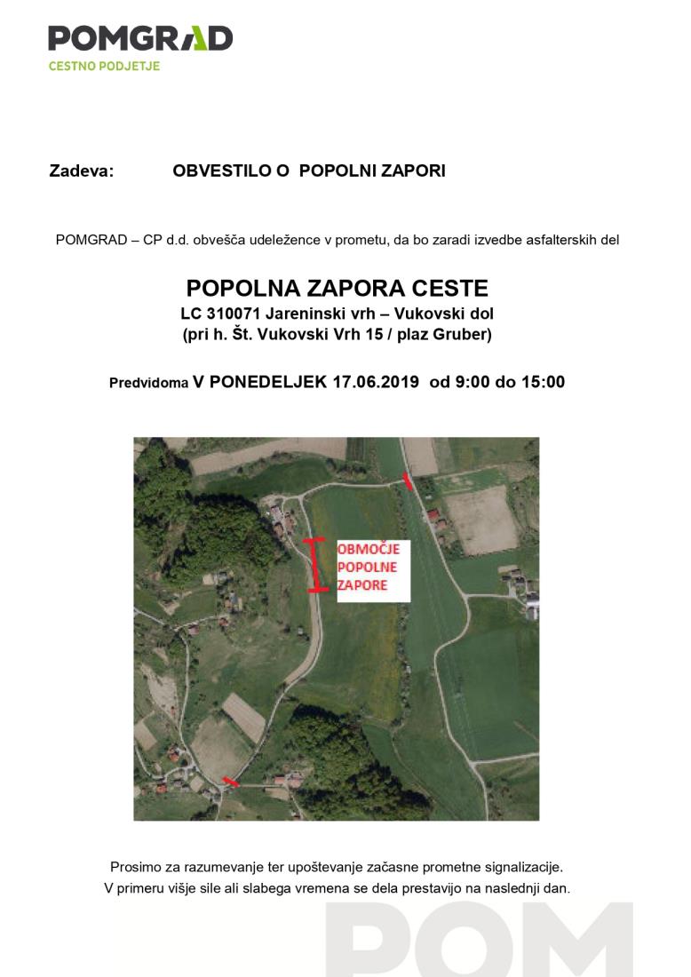 POMGRAD – CP d.d. obvešča udeležence v prometu, da bo zaradi izvedbe asfalterskih del POPOLNA ZAPORA CESTE LC 310071 Jareninski vrh – Vukovski dol (pri h. Št. Vukovski Vrh 15 / plaz Gruber).